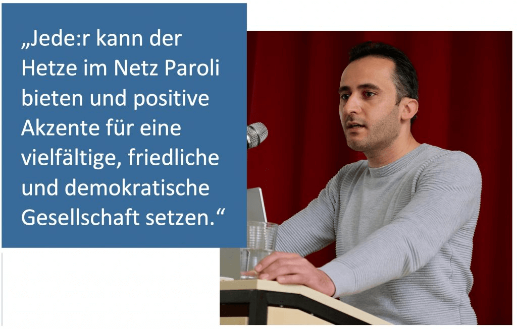 Doch beim Klagen über fehlende Empathie für Jüdinnen und Juden belässt es Mansour nicht. Als Geschäftsführer der Mansour-Initiative für Demokratieförderung und Extremismusprävention in Berlin ist er bundesweit unterwegs. Dabei spielt auch der verantwortungsvolle Umgang mit social media eine Rolle, bei dem Mansour den Eltern eine Vorbildfunktion zuweist.