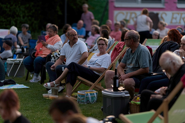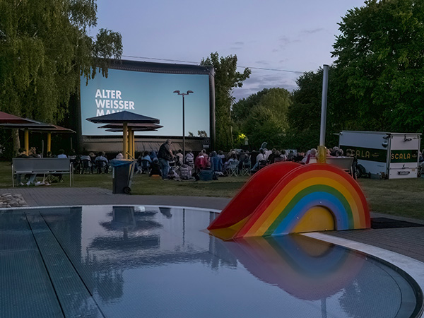 Anderntags wird die Komödie „Alter weißer Mann“ an selber Stelle im Erlbad vorgeführt. Die Komödie von Simon Verhoeven aus dem Jahr 2024 zeigt Jan Josef Liefers in der Rolle von Heinz Hellmich, der sich seine „woke“ Seite unter Beweis stellen muss, um in den Genuss einer lang ersehnten Beförderung zu kommen. Auf Bitten seines Vorgesetzten lädt Helmich zu einem privaten Dinner ein, bei dem die Fassade der Familie schnell anfängt zu bröckeln. Die Veranstaltungen beginnen um 20 Uhr mit einem selbst mitgebrachten Picknick. Sitzgelegenheiten für die Liegewiese im Erlbad sind von den Besuchern mitzubringen.