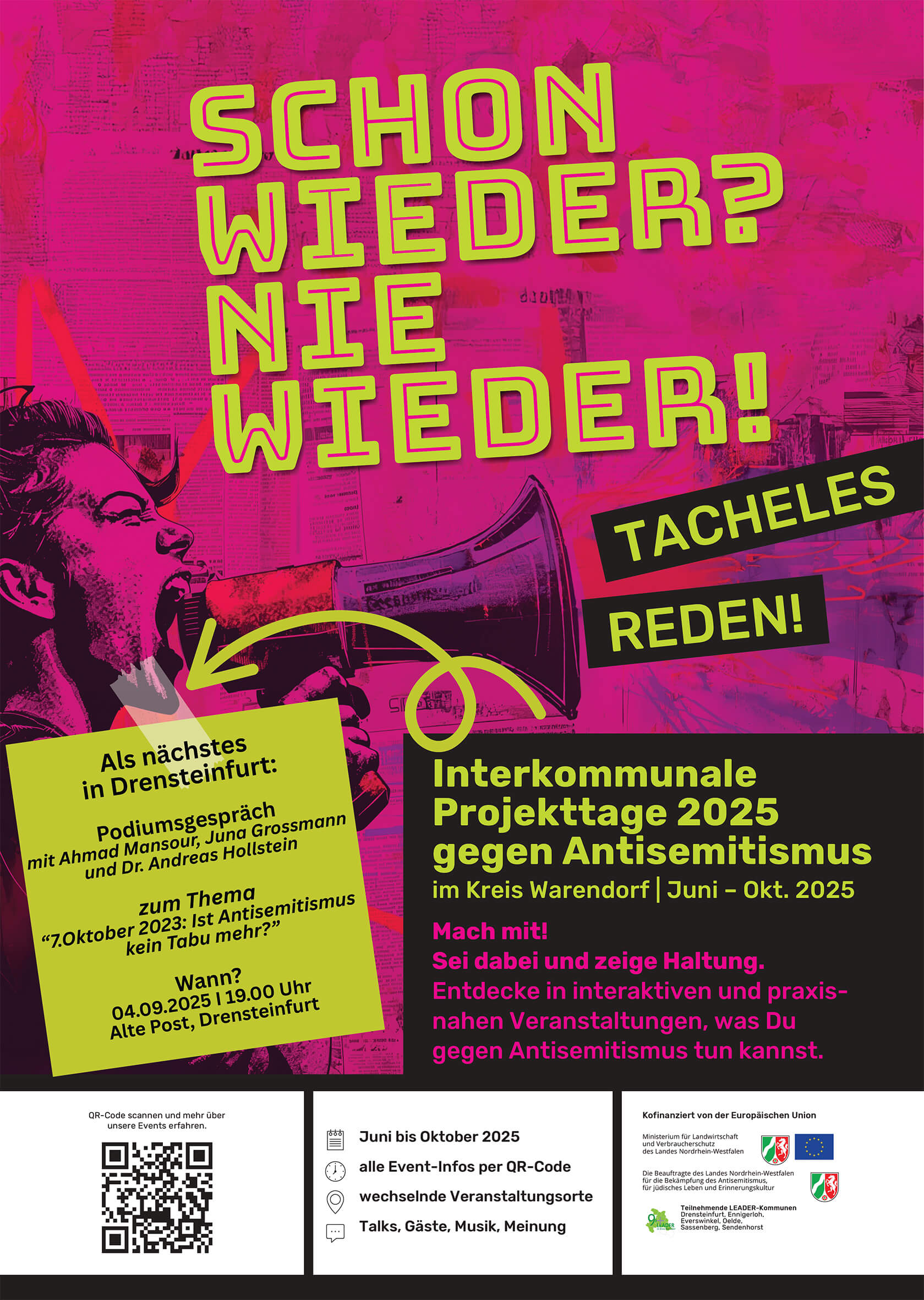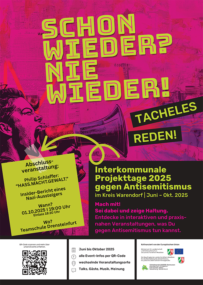 Antisemitismus, Hass und Hetze sind ein schleichendes Gift, das unsere Gesellschaft bedroht: Es sucht Sündenböcke, schüchtert Menschen ein, verbreitet Angst und mündet auch in Gewalt. Dem treten wir entgegen: Mit Informationen, Diskussionen, Konzerten, Ausstellungen, Graffiti-Workshops, Kino und Theater. Mitmachen kann jede(r). Den ganzen Sommer 2025 lang. An vielen Orten im Kreis Warendorf.