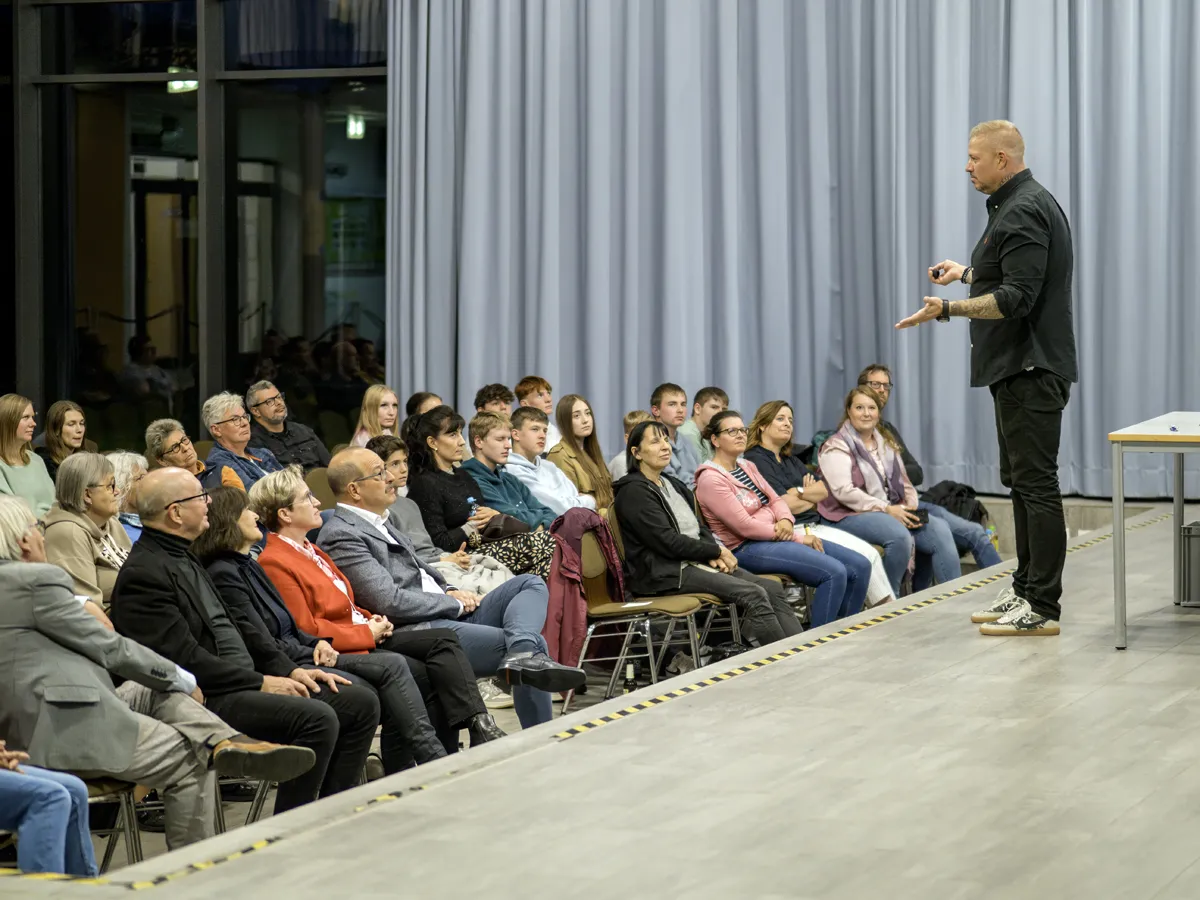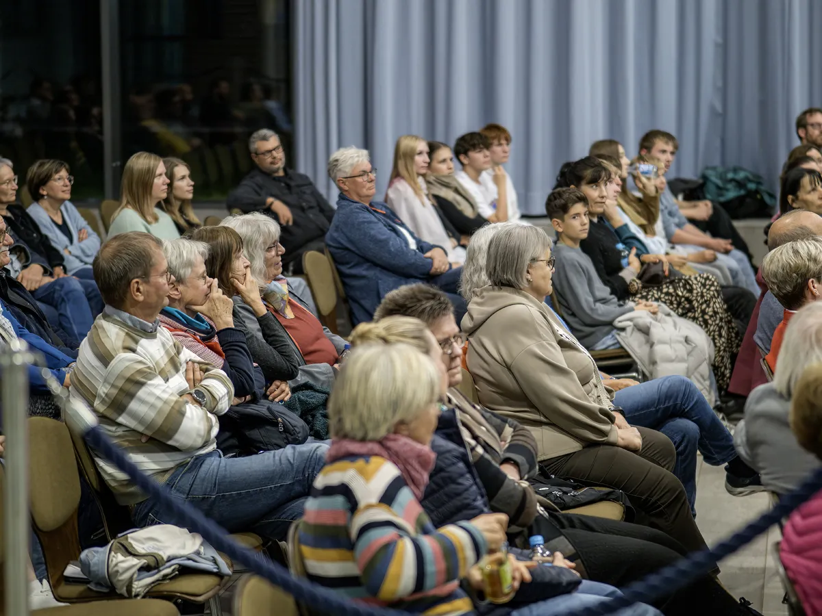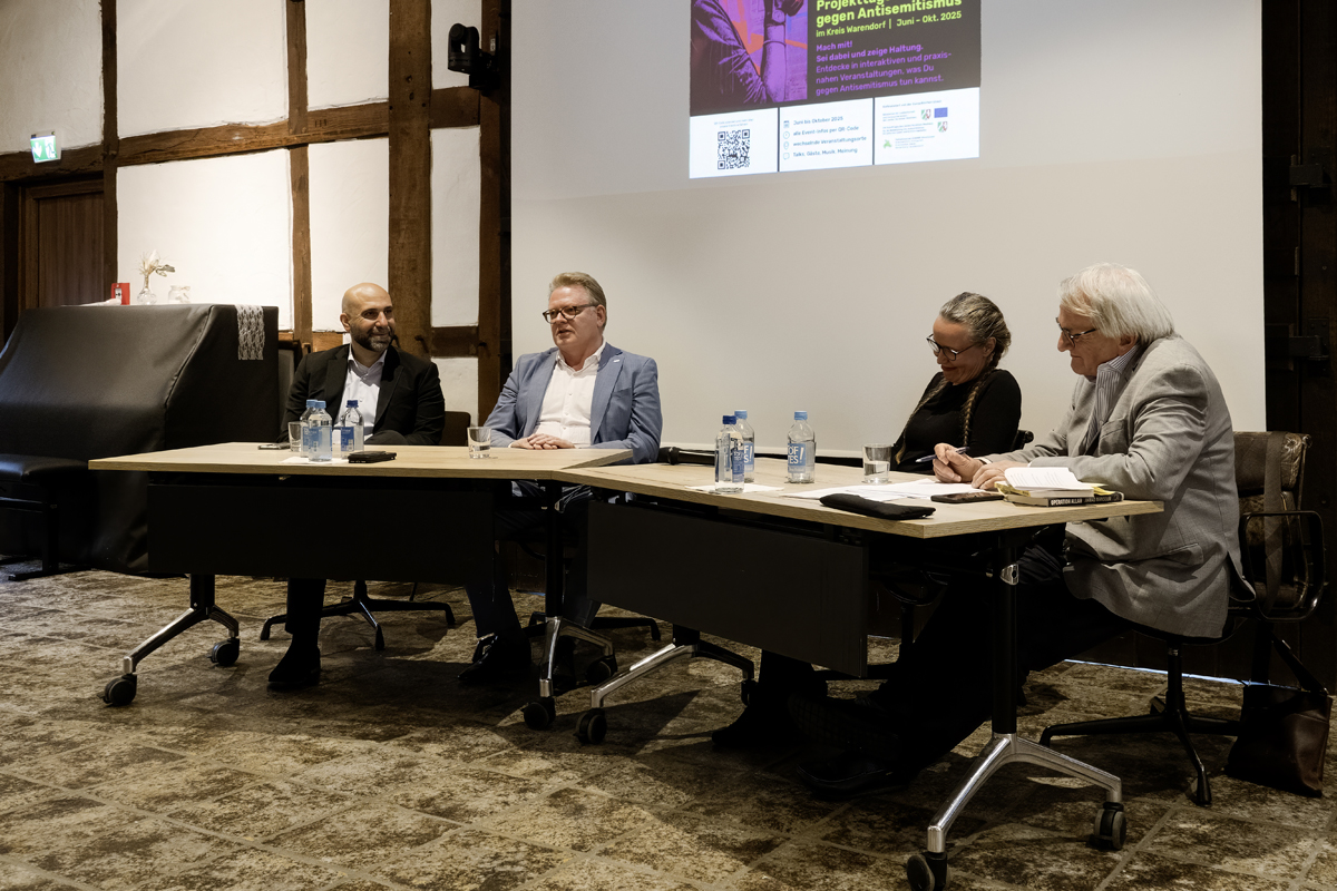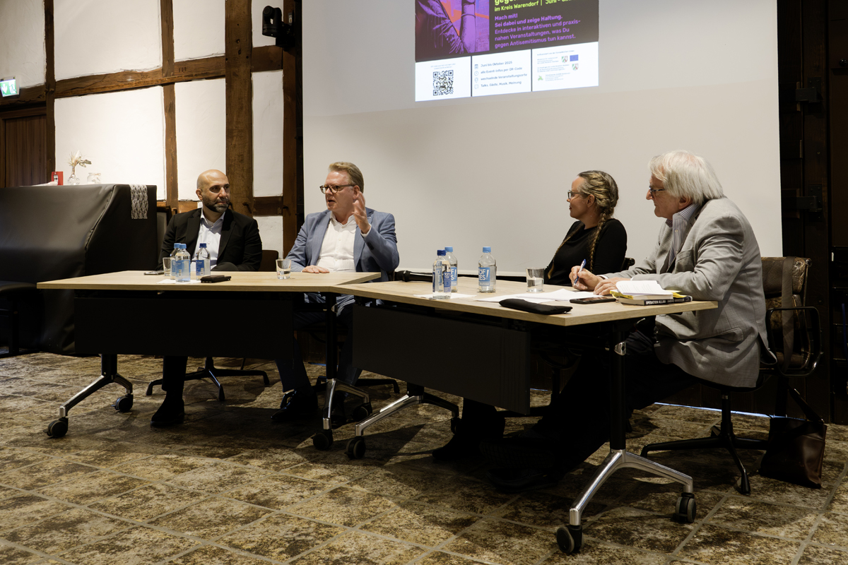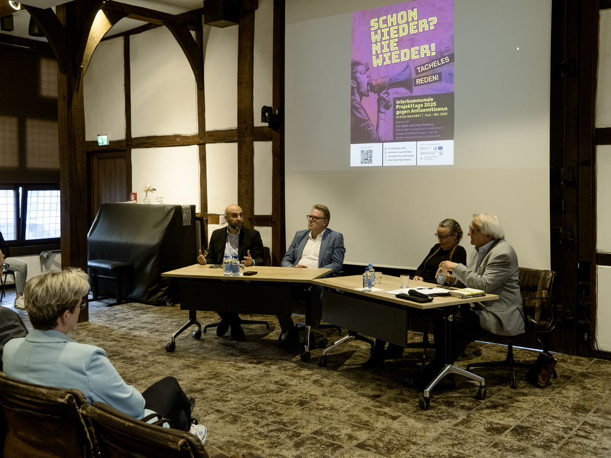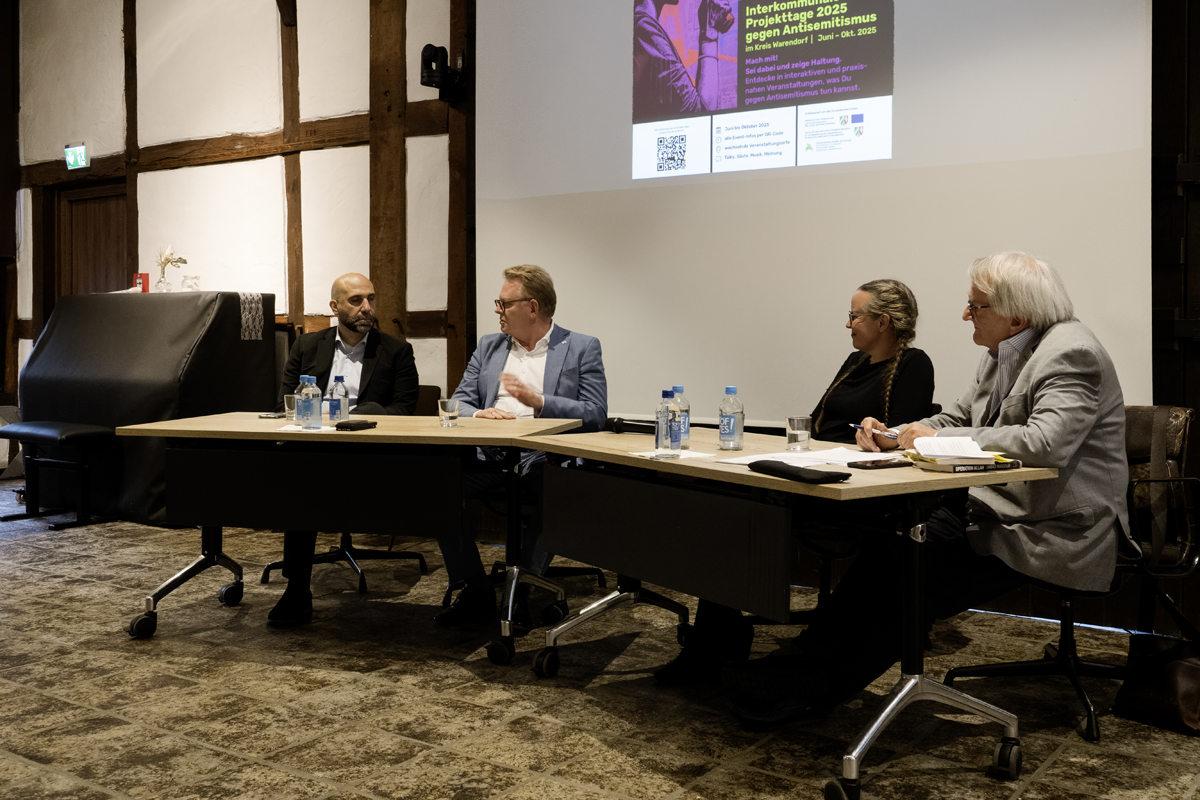 Nach der Begrüßung durch Bürgermeister Carsten Grawunder, der die Bedeutung hervorhob, diese antisemitischen Tendenzen entschlossen entgegenzutreten, stellte Projektkoordinatorin Regina Helm-Rickes die Gesprächsteilnehmer vor: Ahmad Mansour, Juna Grossmann und Dr. Andreas Hollstein. Mansour, Wissenschaftler mit israelisch-palästinischer Herkunft, der seit 2004 in Deutschland lebt und sein Psychologiestudium 2009 an der Humboldt-Universität in Berlin abschloss, stellte die Frage, warum am Tag nach dem Hamas-Überfall auf Israel, bei dem fast 1200 Menschen getötet und Hunderte verletzt wurden, in Berlin nur 16 000 Demonstranten auf die Straße gegangen seien, während Zehntausende gegen den Überfall Russlands auf die Ukraine und Hunderttausende gegen das Potsdamer Geheimtreffen der AfD gewesen seien. Und die Demonstration sei noch im Wesentlichen von jüdischen Organisationen vorbereitet worden, ergänzte Juna Grossmann, Bloggerin.